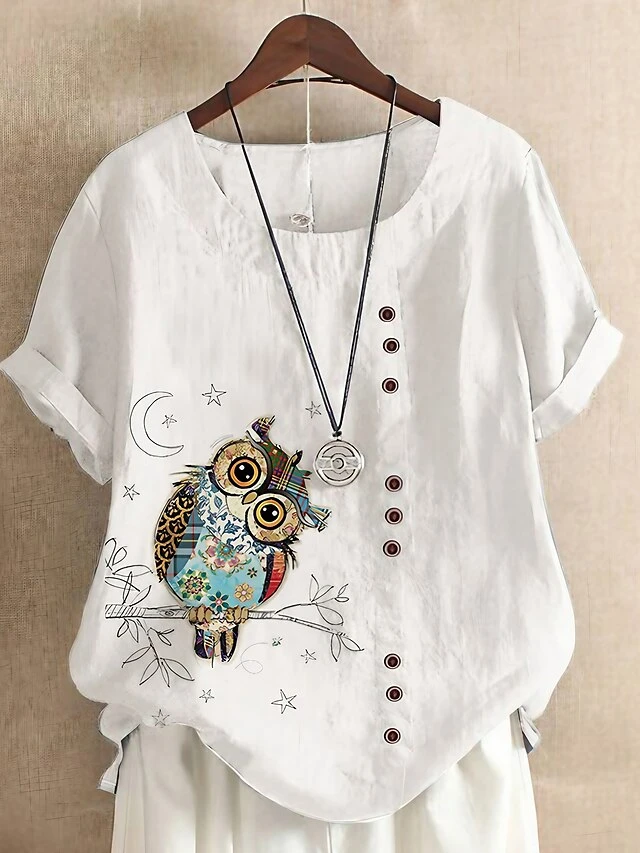 Women’s Shirt Blouse White Animal Button Print Short Sleeve Casual Basic Round Neck Regular Fit