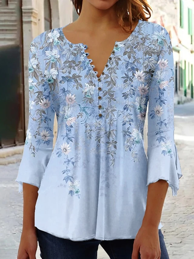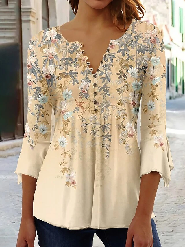 Women’s Shirt Blouse Yellow Blue Purple Floral Button Print 3/4 Length Sleeve Holiday Basic Round Neck Regular Fit Floral