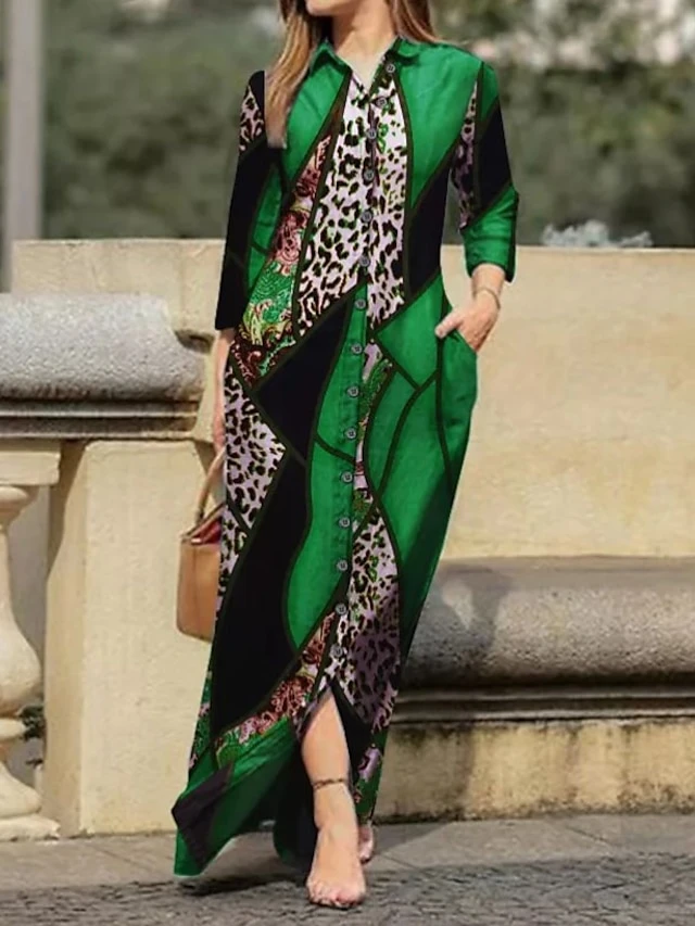 Women’s Shirt Dress A Line Dress Maxi Long Dress Winter Dress Daily Holiday Polyester Elegant Modern Shirt Collar Patchwork Embroidered Long Sleeve Summer Spring Fall 2023 Regular Fit Yellow Red Green