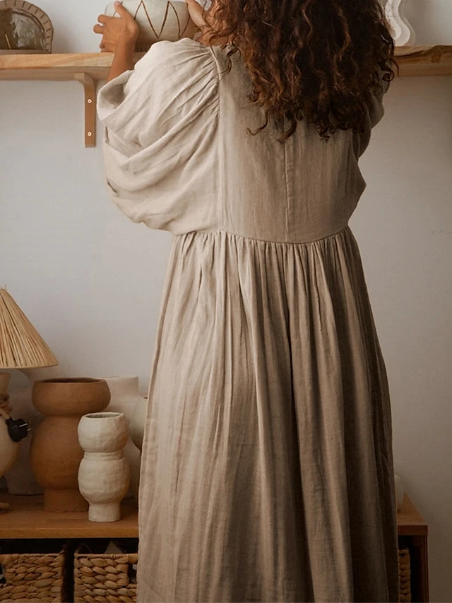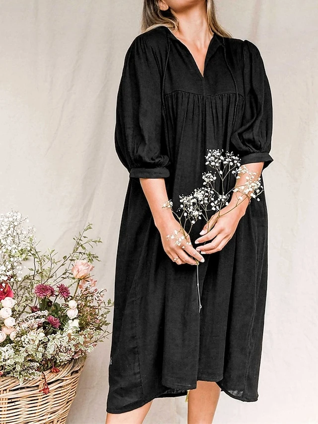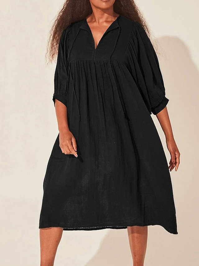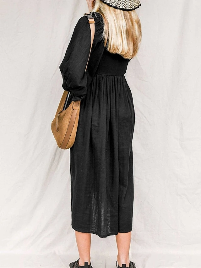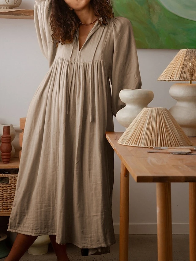 Women’s Shirt Dress Casual Dress Midi Dress Outdoor Daily Date Cotton Basic Classic V Neck Ruched Long Sleeve Fall Winter 2023 Loose Fit Black Green Apricot Pure Color S M L XL