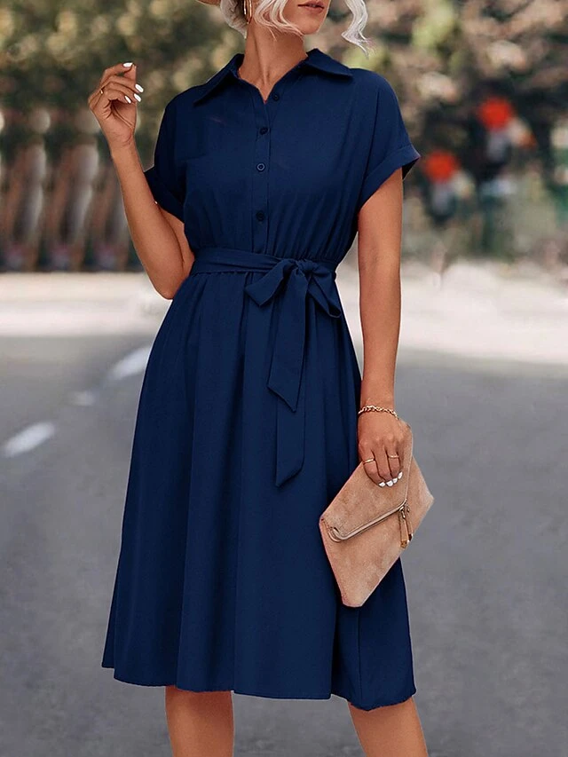 Women’s Shirt Dress Casual Dress Midi Dress Outdoor Daily Date Polyester Casual Classic Shirt Collar Lace Up Ruched Short Sleeve Summer Spring 2023 Loose Fit Black Blue Rose Red Plain S M L XL