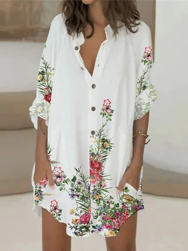Women’s Shirt Dress Casual Dress Mini Dress Winter Dress Daily Holiday Polyester Casual Shirt Collar Button Pocket Long Sleeve Summer Spring Fall 2022 Loose Fit White Pink Blue Leopard Floral