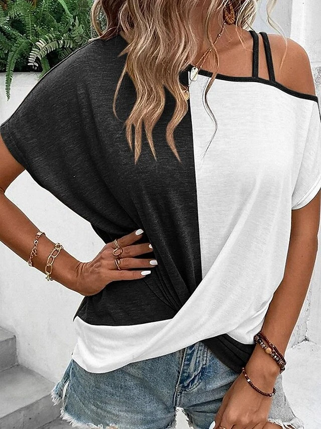 Women’s T Shirt Tee Black Green Khaki Color Block Cold Shoulder Print Short Sleeve Daily Weekend Basic One Shoulder Off Shoulder Regular Fit
