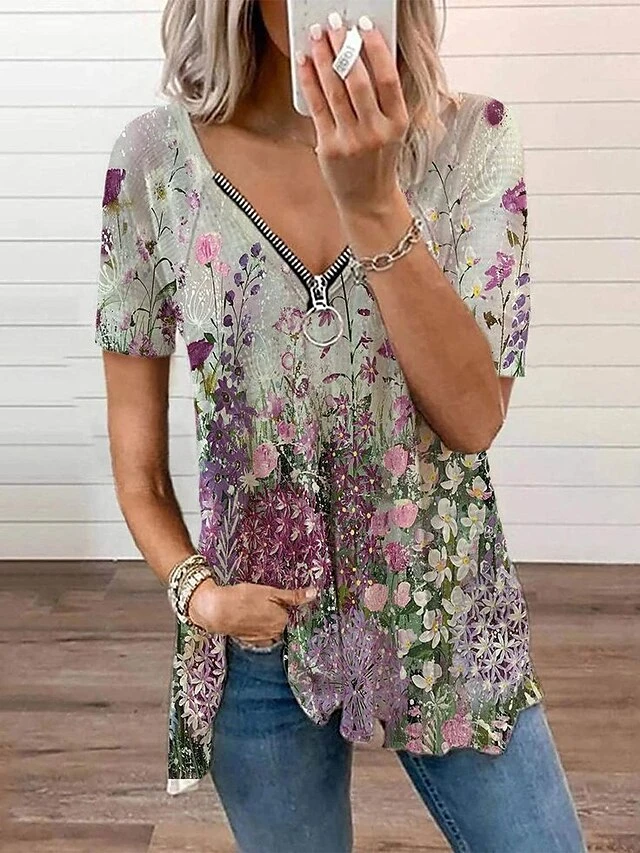 Women’s T Shirt Tee Blue Purple Orange Floral Quarter Zip Print Short Sleeve Casual Holiday Basic V Neck Regular Fit Floral Sleeveless