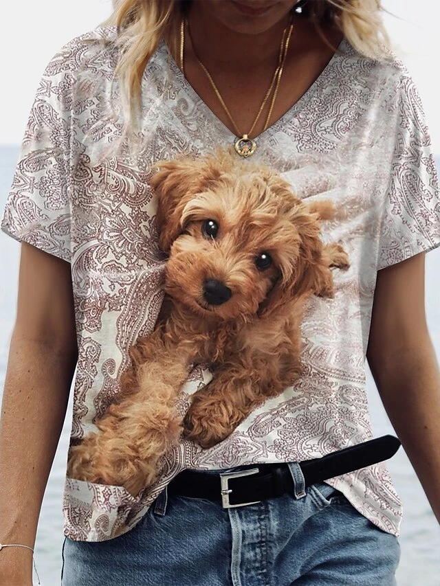 Women’s T Shirt Tee Brown Dog Print Short Sleeve Daily Weekend Basic V Neck Regular Fit Painting