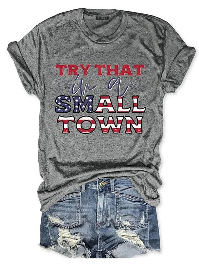 Women’s T Shirt Tee Gray Letter Print Short Sleeve Daily Weekend Basic Round Neck Try That In A Small Town Regular Fit Painting