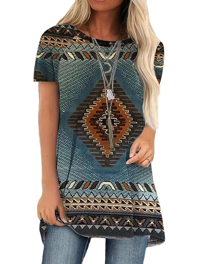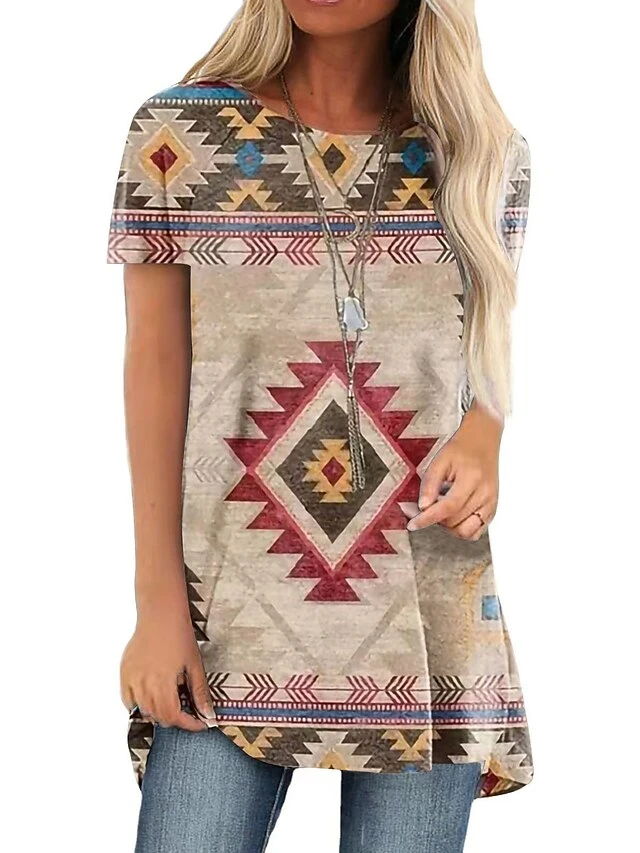 Women’s T Shirt Tee Maroon Red Navy Blue Graphic Plaid Tribal Patchwork Print Short Sleeve Home Casual Daily Vintage Ethnic Round Neck Regular Fit Geometric