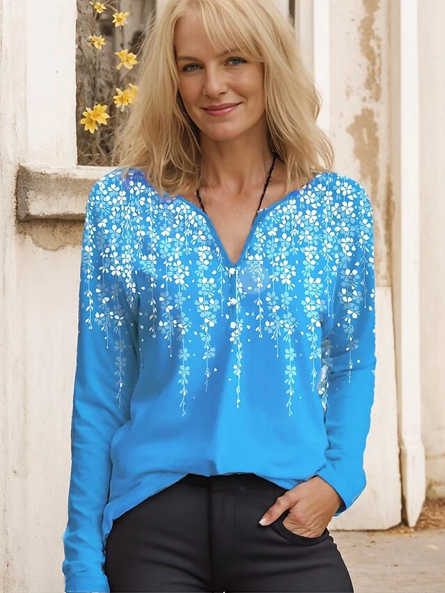 Women’s T Shirt Tee Yellow Pink Red Floral Button Print Long Sleeve Daily Weekend Basic V Neck Regular Fit Floral Painting Spring &Fall