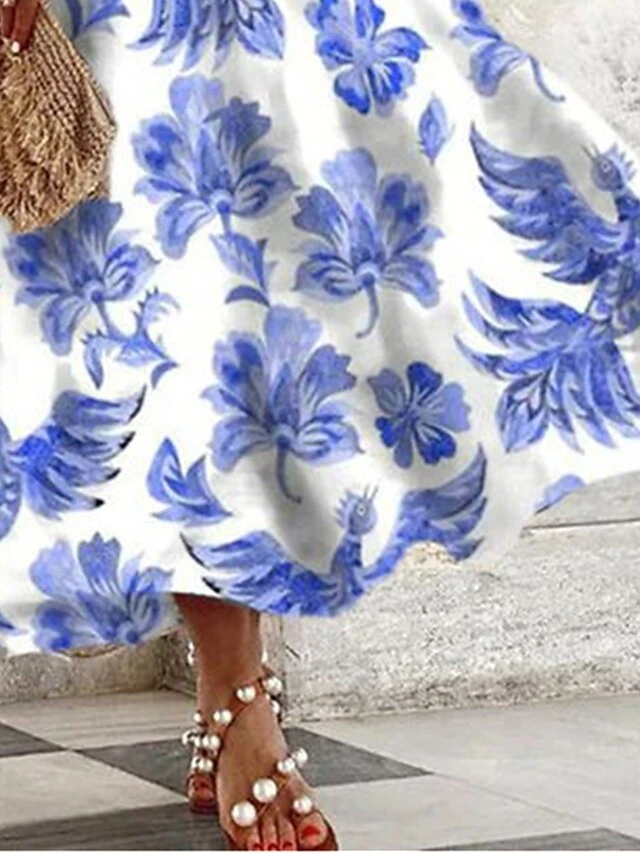 Women’s Two Piece Dress Set Casual Dress Swing Dress Outdoor Daily Fashion Elegant Lace Up Print Long Dress Maxi Dress Crew Neck Short Sleeve Floral Regular Fit Blue Summer Spring S M L XL XXL