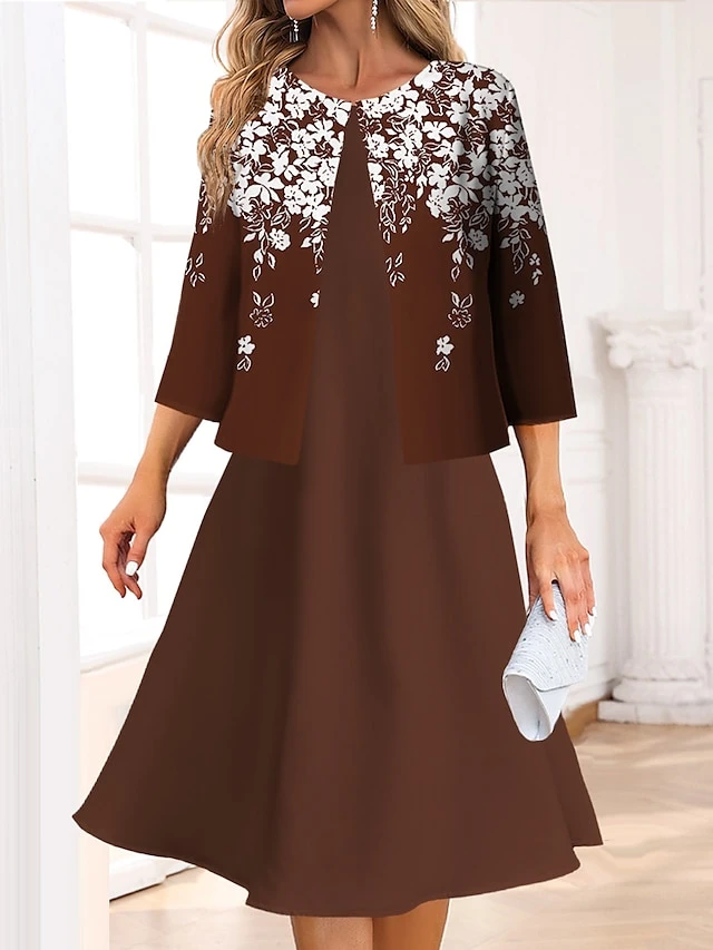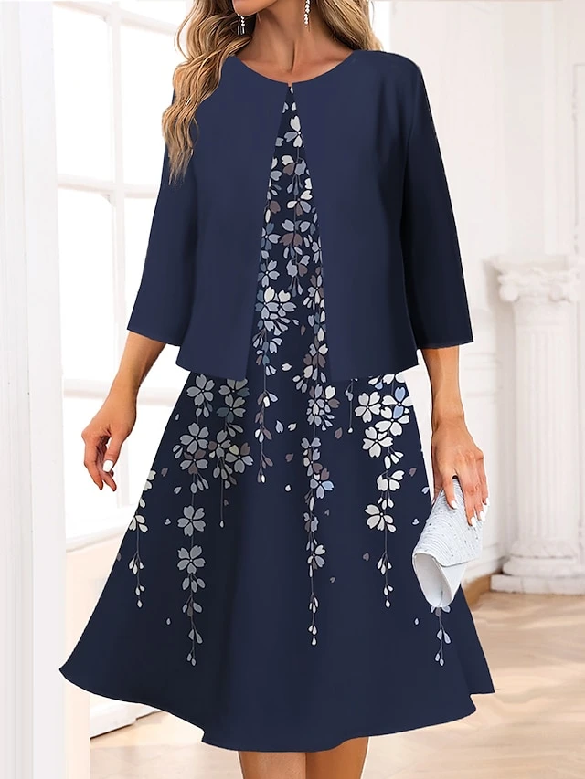 Women’s Two Piece Dress Set Casual Dress Swing Dress Outdoor Office Fashion Streetwear Print Midi Dress Crew Neck 3/4 Length Sleeve Floral Regular Fit Wine Navy Blue Blue Spring Fall S M L XL XXL