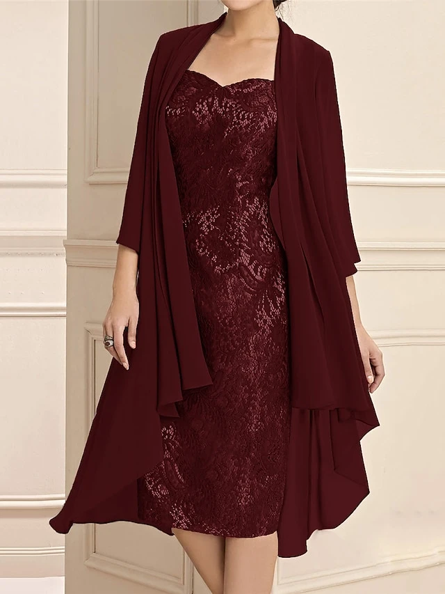 Women’s Two Piece Dress Set Party Dress Lace Dress Party Outdoor Fashion Streetwear Lace Patchwork Midi Dress V Neck 3/4 Length Sleeve Plain Regular Fit Wine Fall Winter S M L XL XXL